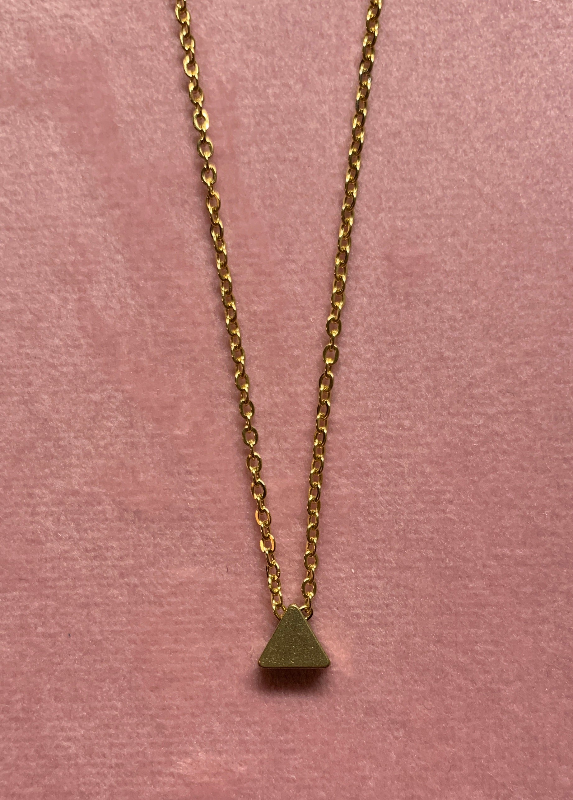 Very simple yet beautiful triangle pendant made of brass with stainless steel golden chain.